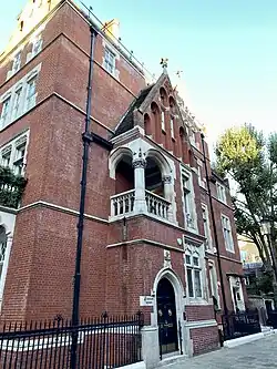 Most of Street's works were in relation to churches; designing new churches, restoring and making additions and alterations to existing churches, and designing fittings and furnishings for them.[2] He also designed domestic buildings, especially vicarages, and schools with houses for the schoolmaster. He designed little in the way of public buildings, although towards the end of his life he designed what has been described as his "greatest commission", the Royal Courts of Justice in London.[1] Most of his works were in England, especially within and close to the diocese of Oxford, but examples of his work can be found throughout England, Wales and Ireland. He also designed some buildings abroad, including a church in Constantinople. Almost all his designs are in Gothic Revival style, in particular, in what is known as the High Victorian style. This style came chronologically after the use of "pure" and "correct" use of features of English Gothic architecture, which had been championed by A. W. N. Pugin and the Ecclesiological Society. High Victorian incorporated the use of polychromy, and elements of Continental forms of Gothic architecture. Street died in 1881, and was buried in Westminster Abbey.[1]