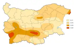 Seismic hazard map of Bulgaria, showing the calculated Peak Ground Acceleration in terms of g for a 475-year period