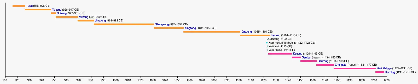 | Daozong (道宗 Dàozōng) | Yelü Hongji (耶律洪基 Yēlǜ Hóngjī) | 1055–1101 | Qingning (清寧 Qīngníng) 1055-1064[17] Xianyong (咸雍 Xiányōng) 1065-1074[18] Taikang (太康 Tàikāng) or Dakang (大康 Dàkāng) 1075-1084[19] Da'an (大安 Dà'ān) 1085-1094[20] Shouchang (壽昌 Shòuchāng) or Shoulong (壽隆 Shòulóng) 1095-1101[21] | |