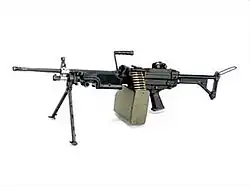 | Sumitomo MINIMI 5.56mm Machine Gun | Light machine gun | 5.56×45mm NATO | Made under license by Sumitomo, standard squad-level machine gun. Unique to the Sumitomo Minimi, the barrel has a heat shield.[10] |