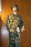 Recently adopted by the JGSDF | Modified from ''Type II'' pattern with a 50% cotton/50% vinylon or 70% vinylon/30% cotton fabric (depending on the year of contract/manufacturer) and other changes including a change in the front closure, a mandarin collar, Velcro cuffs and pocket lids, wider pen pockets, a loop inside the right chest pocket for ID card chain, two calf storage pockets, and knee pads in the trousers. The back pocket on the trousers has been eliminated. The belt (made from the same fabric) comes with a name tag, unlike the former Type II Combat Uniform/Type II Camouflaged Work Uniform. The Type III Combat Uniform/Type III Camouflaged Work Uniform(戦闘服3型・迷彩作業服3型, or shortly 戦闘服)has the same pattern as the Type II camouflage. Each soldier receives two sets of the Type III Work Uniform after enlisting, and after the boot camp each soldier receives two sets of Type III Combat Uniform, Airborne Uniform or Tank Uniform, depending on the unit the soldier belongs to. The Combat Uniform and Camouflaged Work Uniform are identical to each other, except for the product tag. Commercial version of the item (100% polyester version, cotton/poli version etc.) is no longer authorized to be used, including the vinylon/cotton fabric version. The use of commercial combat cap in vinylon/cotton fabric is authorized. The commercial versions have slightly different shades. | 2007–present |