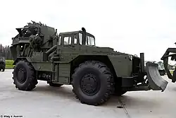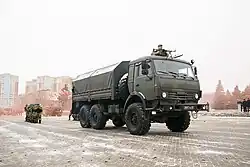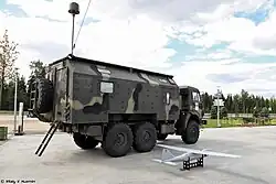 C-band ultra-high frequency (300 MHz-1 GHz) 2D target acquisition radar designed to acquire the range and heading of small targets flying at low altitudes. Installed on KamAZ-43114 6×6 off-road chassis.