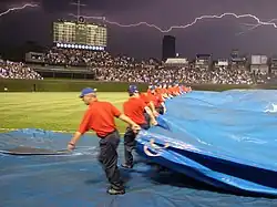 • August 4, the stadium was evacuated after tornado warnings in downtown Chicago. The Federal Signal Modulator behind left field sounded for the surrounding Wrigleyville area and farther east in downtown Chicago. This marks the first time that Wrigley Field was evacuated due to threatening weather.