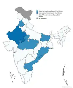 - ^ This column only names the deputy chief minister's party. The state government she heads with chief minister may be a complex coalition of several parties and independents; these are not listed here.