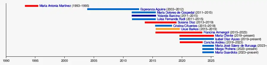 July 6, 2023 | Incumbent | 2 years and 43 days | People's Party | Third woman in a row to serve as president of the Balearic Islands.