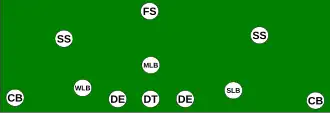 The 3–5–3 refers to a defense that has three down linemen (the "3" level), three linebackers and two corners (the "5" level), one free safety and 2 strong safeties (the "3" level). This is similar to a 33 stack, but with players more spread. Also called the "umbrella" defense or "3-deep". In this set, the third safety would be referred to as a "weak safety" (WS) and allows two position safeties at the mid-level with a third safety deep. It is because of this that the secondary safety in a football defense is called a free safety rather than a weak safety