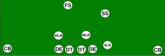 The 6-2 defense consists of six defensive linemen, two linebackers, and three defensive backs (one safety, two corners). This was the primary defense in football, at all levels, during the single wing era (the 1930s), combining enough passing defense to handle the passing attacks of the day along with the ability to handle the power running games of the times.[36][32][37][38] As the T formation grew popular in the 1940s, this formation was replaced in the NFL with the 5-3 and the 5-2 defenses. This defensive formation is still used as a "goal line" formation with some NFL teams.