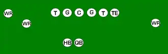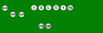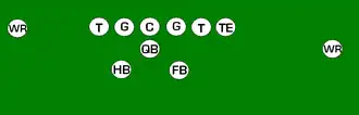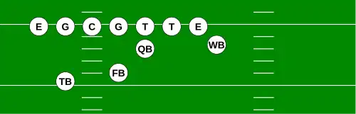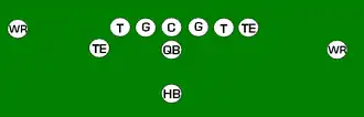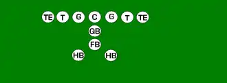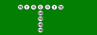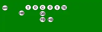 One variation of the T Formation would be where all the running backs would be closer than usual, being at fullback depth rather than halfback depth. Another variation of the "balanced T" formation is the so-called "unbalanced T" formation.[2] In this configuration the line of scrimmage has an end and tackle left of center, while to the right of the center are two guards, a tackle, and an end. This creates a line that is weighted toward the right of the center. With the backfield lining up in the conventional T formation behind the center (quarterback, two halfbacks and fullback), the resulting configuration is "unbalanced" due to the asymmetry of the placement of the linemen. The "split T" spreads the offensive line out over almost twice as much ground compared to the conventional T formation. This causes the defensive line to also spread out, creating gaps the offense can exploit.[3]