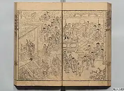 The classic Chinese novel Investiture of the Gods (also commonly known as Fengshen Yanyi) contains a register of deities (Chinese: 封神榜). According to Fengshen Yanyi, Yuanshi Tianzun ("Primeval Lord of Heaven") bestows upon Jiang Ziya the Fengshen bang (Register of Deities), a list that empowers him to invest in the gods of heaven. Through this power, he elevates the heroes of Zhou and some of their fallen enemies from Shang to heavenly rank, essentially making them gods. This act of deification serves as the central event and inspiration for the novel's title. In Chinese folk religion, the register of deities was left by the primordial goddess Nüwa.[1] The register includes 365 gods among the Eight Divisions of Heaven. These figures, upon entering the Fengshen Bang, are granted godhood and are still worshipped in the Taoist pantheon of modern times.[2]