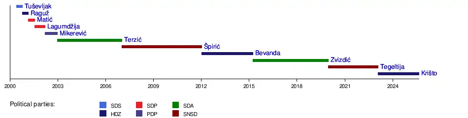 Croat | 25 January 2023 | Incumbent | 2 years, 205 days | HDZ BiH | Krišto | SNSD–HDZ BiH–SDP BiH–NiP–NS–DNS–BHZ | 2022 | |