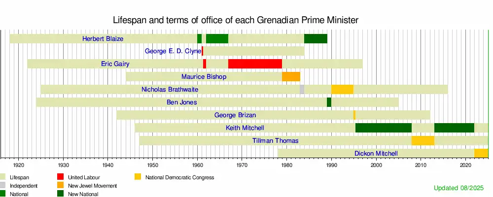 This is a graphical lifespan timeline of prime ministers of Grenada. They are listed in order of office, with those who served multiple premierships being shown in order of their first.
