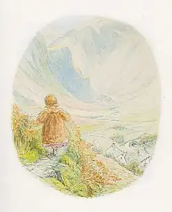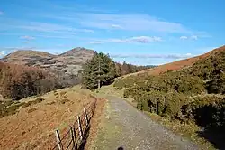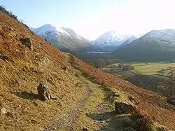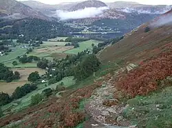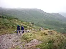 In the late 18th century the region started to become popular with travellers and the "Lake Poets" began seeing the lakes and mountains as beautiful rather than horrifying.[20] In Victorian times, encouraged by the arrival of the Kendal and Windermere Railway,[1] a tourist trade developed. In the mid twentieth century Alfred Wainwright inadvertently encouraged further recreational use with his series of books A Pictorial Guide to the Lakeland Fells which described detailed routes to the major summits. His considerable knowledge of the district allowed him to make use of the ancient tracks although his focus was not on the ridge passes themselves.[21]