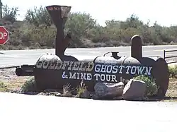 This article catalogs the historic properties in the mining town of Goldfield, Arizona. The town was originally known as Goldfield, later renamed to Youngberg and again named Goldfield by the current owners.[1] The list below highlights a photographic gallery of some of the town's historic structures—all of which were either restored or rebuilt. The town was founded in 1893, after the discovery of gold in the surrounding area of the Superstition Mountains. The town was abandoned twice by its residents after the mine veins faulted. The land where the town is located was purchased by a private investor and is now a tourist attraction. Goldfield's Superstition Narrow Gauge Railroad is the only 3 ft (914 mm) narrow-gauge railroad in operation in Arizona. Other attractions include re-enactments of gunfights on the Main Street of the town.