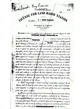 - ^ Second KDKA license: November 7, 1921 (Limited Commercial license, serial No. 174, issued to the Westinghouse Electric and Manufacturing Company in East Pittsburgh, Pennsylvania for a one year period.)