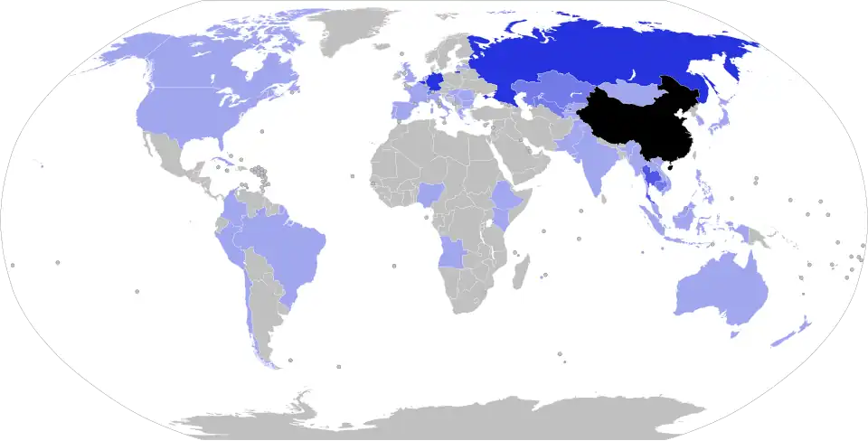 One visit to: Angola, Australia, Brazil, Brunei, Bulgaria, Canada, Chile, Colombia, Croatia, Cuba, Ethiopian, France, Greece, Hungary, Indonesia, India, Ireland, Italy, Japan, Kenya, Kyrgyzstan, Laos, Latvia, Malaysia, Mongolia, Myanmar, Netherlands, New Zealand, Nigeria, Pakistan, Peru, the Philippines, Portugal, Romania, Serbia, Singapore, South Korea, Spain, Tajikistan, the United Kingdom, the United States, Vietnam