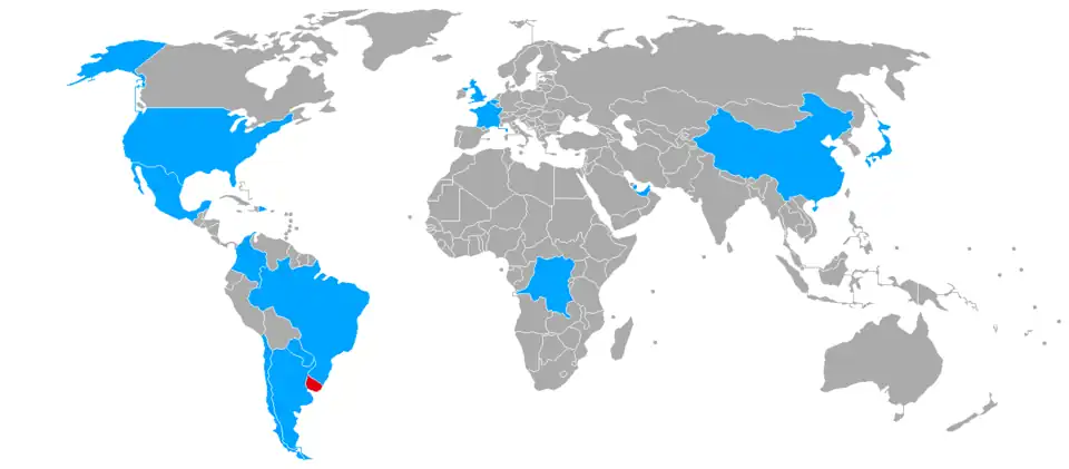 Countries visited by Lacalle Pou during his presidency (in light blue) and Uruguay (in red).