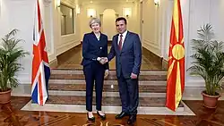 Macedonia Skopje 17–18 May May became the first British Prime Minister to visit Macedonia in 20 years. She discussed post-Brexit trade with Macedonian Prime Minister Zoran Zaev.[99]