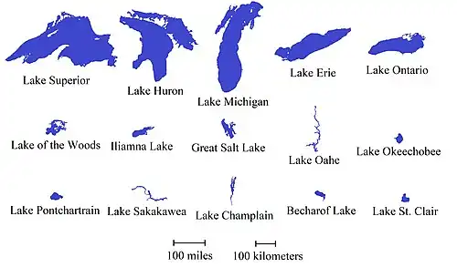 - ^ One of the Great Lakes; considered the largest lake in the United States by the National Atlas of the United States.