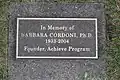 South of the Wham Education Building outside the main underpass | Memorial | Dr. Barbara Cordoni | "In Memory of Barbara Cordoni, Ph.D. 1933 - 2004 Founder, Achieve Program" | Unknown |