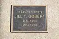| At the end of Morava Point on the Campus Lake Trail on the west side of the lake | Memorial | Jill T. Gobert | "In Loving Memory Jill T. Gobert B.S. 1990 MBA 1998" | 2022 | |