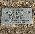North of Lingle Hall near the Banterra Center underneath a tree | Memorial | Matthew Karl Meier | "In Memory Of Matthew Karl Meier 1968 - 1996 Saluki Football 1987 - 1992 Faith-Family-Friendship-Fortitude-Future" | Unknown |