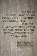 Right side of the main entrance to Pulliam Hall on its south side | Landmark | Pulliam Hall Inscription | "So Enter- That Daily Thous Mayest Become More Learned And Thoughtful So Depart- That Daily Thou Mayest Become More Useful To Thy [...]" | Unknown |