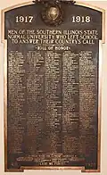 | At the end of the foyer in Shryock Auditorium | Memorial | WWI Memorial | "Men of the Southern Illinois State Normal University who answered their country's call • Roll of Honor • [...]" | 1920 | |