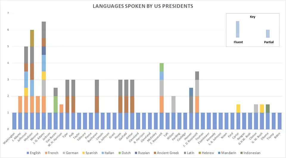 | 6 | John Quincy Adams | Partial | Fluent | Fluent | Partial | Partial | Fluent | Partial | Partial – Russian |