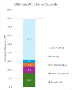 In April 2025 the nameplate capacity of offshore wind farms in operation was approximately 16 GW, with a further 10.4 GW under construction and 1.4GW in Pre-Construction. Contracts for difference for a further 1.4 GW have been awarded by the UK Government. A further 47.3 GW are in early planning stages.