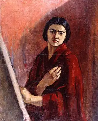 Painted in Paris, it depicts a three-quarter Sher-Gil draped in red, in front of an easel.[8] |