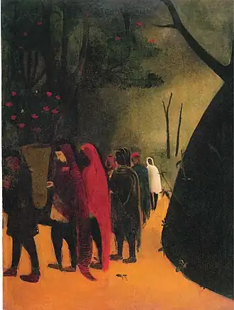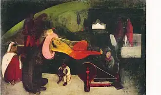 In 1940, six of Sher-Gil's works were displayed at the Indian Academy of Fine Arts' Amritsar Exhibition (31 October – 10 November), to raise money for the War Fund.[22] These included Siesta, Sleep, Elephant Promenade, Elephants, The Swing, and the winning piece, The Ancient Story Teller.[22] Sher-Gil died at midnight on 5 December 1941, leaving The Last Unfinished Painting at Lahore.[21]