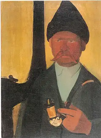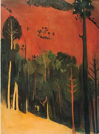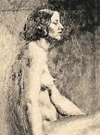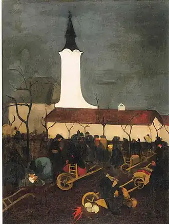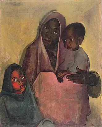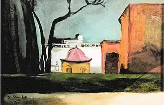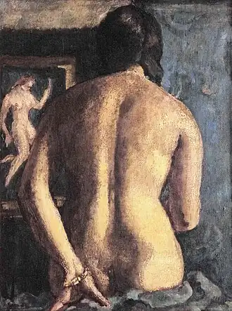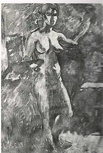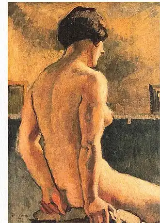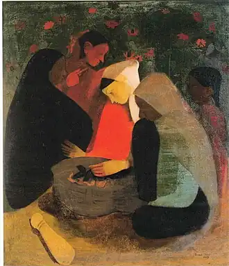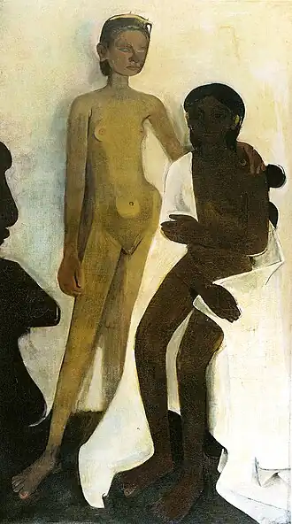 In her early years, Sher-Gil was a frequent visitor to Zebegény, in Hungary.[5] There she painted a church in 1932, and would several years later paint other views of the village including Winter and the Merry Cemetery.[5] The early 1930s were also the years she worked at the École des Beaux-Arts, Paris, painted mostly family and colleagues, and won awards at the annual competitions for portrait and still life for three years in a row.[6] In the summer of 1932, she submitted six paintings to the "end of year concours", Paris, for which she received second mention in her capacity as foreigner.[7] The six included Violins, Nude Self-Portrait with Palette, and Young Girls.[7] In her words, "my work in those days was absolutely Western in conception and execution except for the fact that it was never entirely tame or conventional".[6]