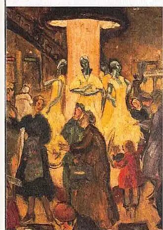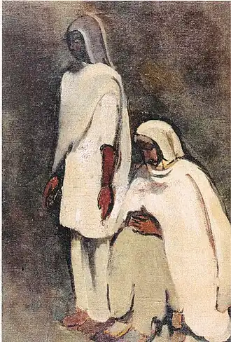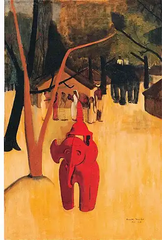 In 1938 five of Sher-Gil's paintings were exhibited at the All India Fine Arts and Crafts Society's exhibition in Delhi, and included Elephants Bathing in a Green Pool (1938), Composition (1936), and View from Studio (1934), which won the prize.[20] In the same year she married Viktor Egan in Hungary, and there painted Two Girls among others.[21] Returning to India in 1939, she moved to Saraya, Uttar Pradesh, and there her creations included Woman on Charpoy, Elephant Promenade, The Ancient Story Teller, and Haldi Grinders.[21][22] The dome of the family's estate features in the background of some of these, though she omits the Saraya Sugar Mills and its chimneys and smoke.[23]