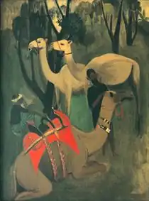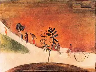 By 1948, the Indian government had acquired 98 of Sher-Gil's paintings.[24] Following her father's death, several paintings of hers were saved by Hungarian-Indian social worker Fori Nehru.[25] The art restorer, Rupika Chawla, found several of Sher-Gil's paintings to have been altered by Sher-Gil herself.[26] These include Siesta, Woman Holding Fan, and Hillside.[26] In 1979 her works including Camels and Ancient Story Teller, were displayed at an exhibition in New delhi, organised by the Budapest Kunsthalle.[9]