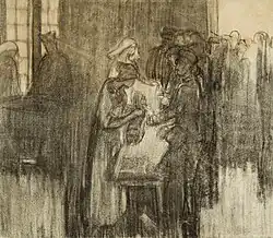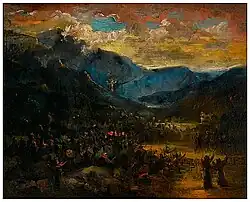 Tanner can be identified by his signature in these works. | Historical painting for magazine, illustrating the article, called The Witch Hunt, by Louise Stockton, in Our Continent magazine, August 30, 1882, pages 233–235.[19][23] | Waiting for the Lord[19] | Historical Society of Pennsylvania. Gouache on board, 13'/2 X 12”.[22] | ![]() | |
