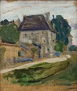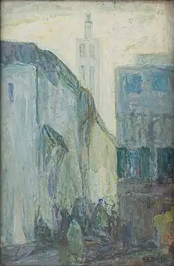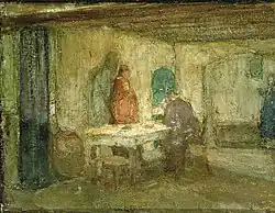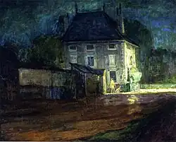 Tanner grew up in Pennsylvania near the house of Nicolas Wynkoop, who built it in 1739. That house would later be owned by "abolitionist" Judge Henry Wynkoop, who freed his slaves.[33] Some of Judge Henry Wynkoop's slaves chose to remain with his family after receiving freedom on his death; a tree became their cemetery marker.[33][34][35] | Picture of a different Wynkoop house in Harlem, Manhattan, New York City dated with signature 1888. Tanner may have painted this as a symbol with civil rights in mind.[33] | Wynkoop House, Old Haarlem | New Britain Museum of American Art, 1984.86. Oil on canvas, 18 1/2 x 13 1/4 in.[32] American realism | ||