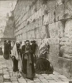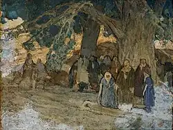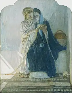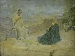 | 1882-1888[23][38] | While still living in Philadelphia, Tanner did a religious artwork.[23] This was years before The Thankful Poor and Daniel in the Lion's Den (1896).[23] His teacher may have been sending students' work in to magazines.[23] | Joachim, father of Mary, maternal grandfather of Jesus | Joachim Leaving the Temple[38] | The Baltimore Museum of Art, 2008.111. Opaque watercolor and graphite, inscribed with a stylus, on paper, 558 × 392 mm. (21 15/16 × 15 7/16 in.)[38] | ![]() | |