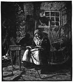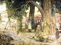 Tanner can be identified by his signature in these works. | Historical painting for magazine, illustrating the article, called The Witch Hunt, by Louise Stockton, in Our Continent magazine, August 30, 1882, pages 233–235.[19][23] | Gathering Faggots[19] and At the Well[19] | ![]() |