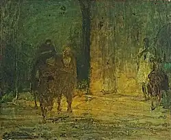 Beginning January 1891, attending school at the Academie Julian in Paris | Painted in France while attending school. The figure between the two dogs in the background is a pentimento of a gypsy boy, a street performer.[51] Tanner painted the petit savoyard (young Gypsy street performer) into the picture, but later removed it, creating the shadowy image.[51] | A Horse and Two Dogs in a Landscape[51] | Woodrow Wilson Middle School Collection, Philadelphia.[52] American realism or French academic | ![]() | |