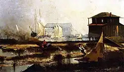 In 1872 he saw a painter painting a landscape in a park and was inspired to paint.[6] Tanner saw paintings at Earle's Galleries in Philadelphia.[6] He spent summers in Atlantic City. | In 1872 (age 13) he decides to become a marine painter. "Tanner's first known painting" was Harbor Scene.[7] This painting completed with no art education.[5] | Harbor Scene | Private collection. Oil on canvas board glued to Masonite. 14 x 20" (35.56 x 50.8 cm) | ![]() | |