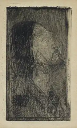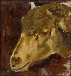 In a biographical article, Tanner wrote of his experience of owning and painting a sheep while at the Pennsylvania Academy of Fine Arts.[15] | Study of a sheep's head. Tanner switched his interest from marine painting to painting animals.[14] | Head of a Sheep[14] | Private collection. Oil on canvas, on board, 10 1/2x10 in. (267x254 mm)[14] | ![]() | |