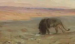 Student work made while Tanner was attending the Philadelphia Academy. The second photo is of the same lion, done at a later date. | Pomp at the zoo | Private collection. Oil on canvas, 20 x 16 in.[13] | ![]() |