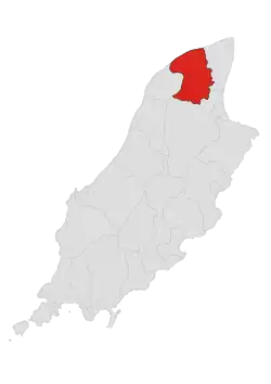 Sheadings and districts of the Isle of Man. The Isle of Man , a self-governing British Crown Dependency , in the Irish Sea has 17 historic parishes and was, until May 2016, divided into 24 districts for administrative purposes. These were 15 remaining parishes , 1 city, 3 towns and 5 villages, each forming the lowest unit of local government in the Isle of Man .[ 1]