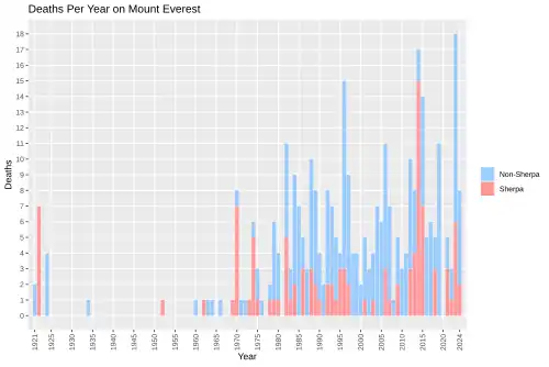 Yearly deaths on Mount Everest 1921-2024. Noting sherpa and non-sherpa deaths.