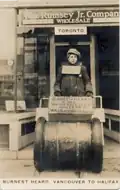 Burnest Heard (born Burnest Watson Heard Wozny[29]), the self-styled "World's Greatest Lover",[30] walked from Vancouver, BC to Halifax, NS and back. Heard set out on 1 June 1937 and arrived in Halifax 19 months later, in December 1939. He pushed a 150-pound oil drum across the country to make it clear that he did not hitch-hike during his journey. Heard paid for his trip by selling postcards of himself, at 10 cents apiece (he claimed to have sold 18,000 of them[31]); staying in hotels and buying his own food.[32] After a rest in Halifax, he began his return trip on 1 February 1940 and took two years and ten months to reach Vancouver (in December 1942). His first cross-country transit was widely reported in newspapers all over the US and Canada; however, his return journey was only featured in the Canadian press.[3][33][34][35]