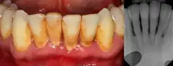 Photograph (left) and a radiograph (right) demonstrating extensive bone loss and soft tissue inflammation due to periodontitis. Plaque, calculus and staining