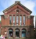 General Baptists, Unitarians and Calvinistic and Strict Baptists have a long and interconnected history in the district. A General Baptist congregation existed in Ditchling in the late 17th century, and a chapel was built c. 1730.[63] A General Baptist chapel built in the Southover area of Lewes from 1741 was associated with it.[64] The chapel at Ditchling became Unitarian later in the 18th century,[65] and some members seceded and founded a new Strict Baptist chapel at Wivelsfield. Bethel Chapel opened there in 1763 and is still in use.[66] Westgate Chapel in Lewes, built c. 1700 for Presbyterians, also adopted Unitarian views in the 18th century, and members of Southover General Baptist Chapel joined in the early 19th century when their views changed in the same way. The old chapel was converted into a house in the 1970s;[67] Westgate Chapel remains in use as a Unitarian place of worship.[50] Elsewhere in Lewes town centre, a General Baptist congregation became established in the town centre in 1818 and built the present much-altered Eastgate Baptist Church in 1843.[50] Nearby, Jireh Chapel opened in 1805 for Independent Calvinistic Baptists and was extended in 1826.[50] The cause declined in the 20th century, and the Free Presbyterian Church of Ulster began using it for worship since 1998.[68] The present Jubilee Christian Centre in Barcombe, a modern building, is the successor to a Strict Baptist chapel founded in 1810.[69] Other Calvinistic or Strict Baptist churches no longer in religious use can be found in Newick (1834),[52] Ditchling (1867),[70] Lewes (two buildings: c. 1860 and 1906)[50] and Newhaven (1904).[52] In the 20th century, Baptist churches were built in both Newhaven and Seaford in 1901.[52][48] The original building at Newhaven still stands and is used as the church hall of the present church, opened in 1938.[52] The chapel in Seaford town centre was demolished in 1973 for commercial development and was replaced by a new circular church building in the East Blatchington area of the town.[48] The Countess of Huntingdon's Connexion, another Calvinist group with links to Methodism, is also represented in the district. The founder of the group, Selina Hastings, Countess of Huntingdon, lived in Wivelsfield and opened a chapel there in 1778—only the second to be founded, and the oldest survivor (the first, opened in Brighton in 1761, has been demolished).[71] Ote Hall Chapel remains in regular use.[72] Another Connexion chapel founded around the same time in the Cliffe area of Lewes was demolished in the late 19th century.[50]