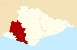 Lewes district covers 113 sq mi (290 km2) of the western part of East Sussex. The English Channel forms its southern boundary for 9 miles (14.5 km); four of the five largest towns in the district—Peacehaven, Telscombe Cliffs, Newhaven and Seaford—are on the coast. Lewes, the administrative centre of the district and the county town of East Sussex, lies inland in the centre of the district. The rest of the district is mostly rural.[5] The city and unitary authority of Brighton and Hove lies to the southwest; the district of Mid Sussex, in the neighbouring county of West Sussex, is to the west; and Lewes's eastern boundary is with Wealden district.[6]