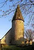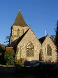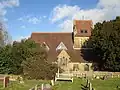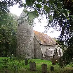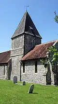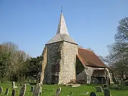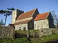 Anglican | I | Victorian restoration has not disguised the 12th-century origins of this small village's church, which stands on the site of a Norman predecessor recorded in the Domesday survey of 1086. The flint structure is long and narrow; the oldest part is the nave, which is separated from the chancel by a substantial, short tower topped by a shingled spire. The windows (mostly lancets) and a piscina are also original. A former north aisle has now vanished. | [156][157] [17] |