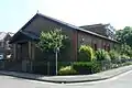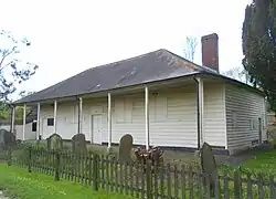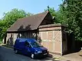 Building materials vary, but many churches are built of local stone. Brownish Bargate stone from the southwest of the county—"tougher, coarser and more durable than Reigate Stone" (also known as firestone)[33]—was used at Buckland,[23] Capel[34] and the Roman Catholic church in Dorking.[35] Among the churches with firestone walls are Brockham (in which it is combined with limestone dressings, giving a polychromatic effect)[36] and Oakwood Hill.[37] Also common, especially on the oldest churches, is flint. This was usually used on its own; the chequerboard pattern of flint and stone squares common in other parts of England is seen at only two Surrey churches, both in Mole Valley: Leatherhead and Mickleham.[38] At the latter, clunch is the other part of the chequerboard pattern.[39] Clunch is also used at Betchworth, along with chalk;[16] and that material (quarried extensively in east Surrey)[38] is also found in the walls of the church at Oakwood Hill[37] and internally at Fetcham and Great Bookham.[38] Ashlar formed from the soft, easily workable stone of the Upper Greensand beds, was commonly used for dressings, quoins and similar.[40] Horsham Stone, a type of sandstone, is often used as a tiling material on roofs.[41] Some places of worship are entirely different in materials and origins, though. A converted cattle shed donated by Sir Benjamin Collins Brodie, 1st Baronet of Broome Park[28] serves as a gospel hall in Betchworth;[42] a timber-framed barn in Westhumble is now used as a chapel of ease to nearby Mickleham's parish church;[43] and Providence Chapel at Charlwood was transported to its isolated site in 1816 from Horsham,[44] where it had been used as an officers' mess during the Napoleonic Wars. The remarkable building, which with its open verandah and white-painted wooden walls "would not be out of place in the remotest part of East Kentucky" in the words of Ian Nairn and Nikolaus Pevsner,[45] served Independent Calvinists and Strict Baptists at various times, but As of 2022 is up for sale.[46]